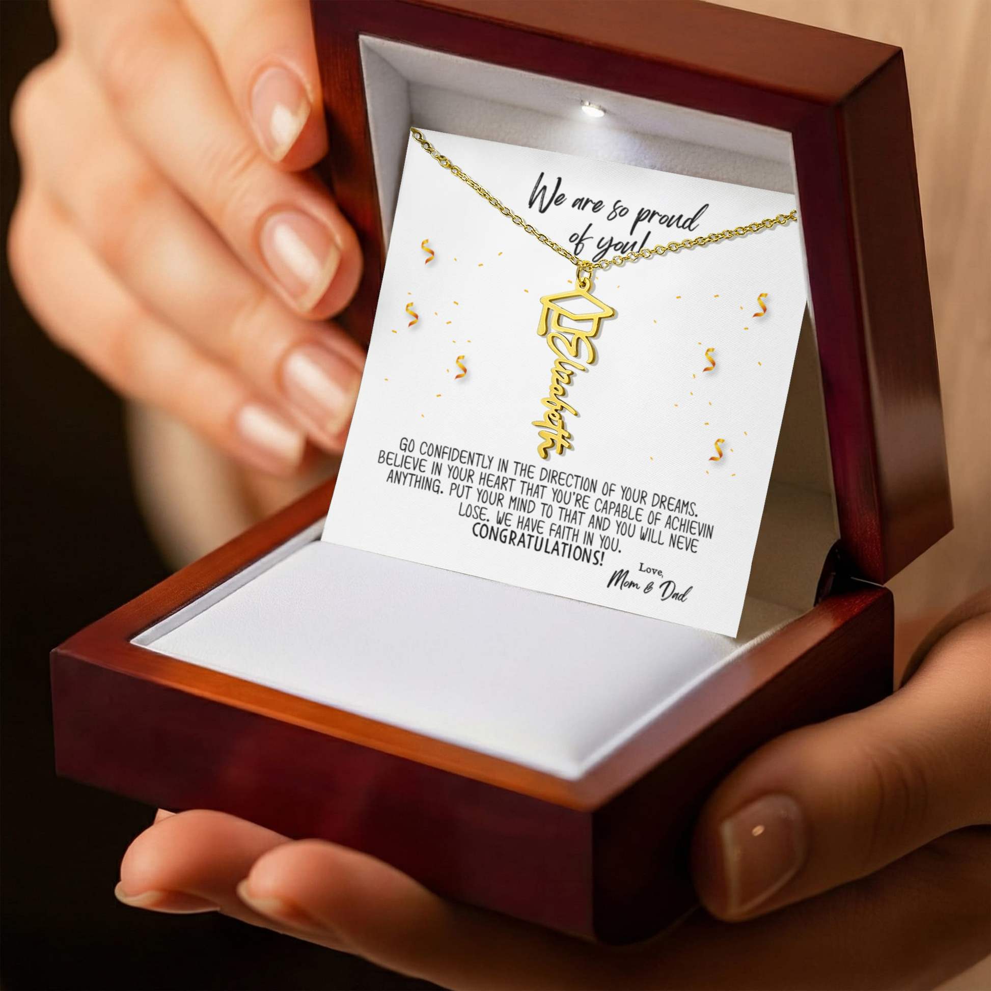 Celebrate her incredible achievement with a meaningful keepsake she’ll cherish forever. This elegant graduation name necklace features a stylish cap design paired with a custom name (shown: Elizabeth) and a heartfelt message from Mom and Dad.